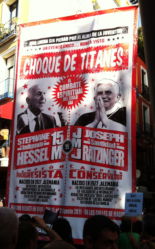 Una hora antes de la establecida para iniciar el recorrido (19:30 horas), la Plaza de Tirso de Molina era ya un hervidero de gente. Carteles con consignas relativas al laicismo y a la separación real del Estado y la Iglesia (en un país declarado aconfesional) eran levantados por manifestantes cuya media de edad era muy superior a la de otras concentraciones de los pasados meses convocadas por el movimiento 15M. Un elemento llamativo fue un enorme cartel colocado en una gran estructura móvil por el actor italiano Leo Bassi que parecía sacado de un combate de boxeo. Bajo el título “Choque de titanes”, Bassi proponía un enfrentamiento entre el escritor alemán Stéphane Hessel, autor del texto ¡Indignaos!, y al actual Papa Benedicto XVI, Joseph Ratzinger.